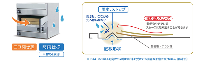 扉の防雨構造に加え、特殊な底板形状により郵便物が濡れにくい設計になっています。防水試験にて、あらゆる方向からの水の飛沫を受けても有害な影響を受けない(防沫形)IPX4を取得しています。